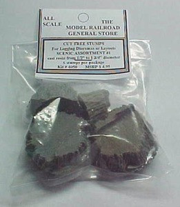 BAG OF STUMPS; various sizes, 6 per bag, this is assortment # 1. Suitable to use in all scales, see chart. Cast from resin, easy to paint and weather. See color photo for reference.