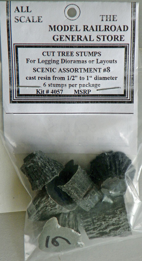 BAG OF STUMPS; various sizes, 6 per bag, this is assortment # 8 Suitable to use in all scales, see chart. Cast from resin, easy to paint and weather. See color photo for reference. NOTE: These are cast in batches during MRGS regular production runs. Not all variations will be in stock all the time, some delays will occur. Please be patient if we don't ship immediately. We will ship ASAP. Small stumps are a premium as there are fewer of them. Due to production variables, we reserve the option to substitute similar and like size items. There are many variations in these stumps. Photos and Bag as shown will be representative. All are cast Resin. Color varies from white (cream) to dark gray, almost black. There is no difference in the material except for the color. These easily paint with any brand of paint; we frequently spray them with Krylon gray or white primer (flat), or Rust-Oleum "Camoflage" and then use various colors of acrylic washes for final color. Great for new cut timber to old rotted stumpage. Color photo (for reference) shows what one finished painted might look like. Standing Figure is S Scale, seated figure is HO Scale. These are for reference only and are NOT included.